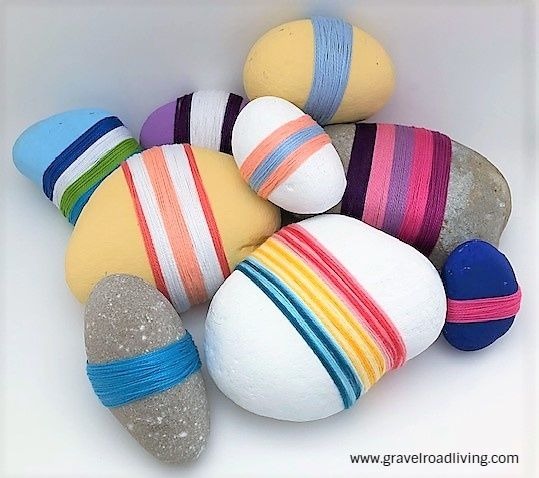 We used crafting string to wrap the rocks, some from Michaels and some from a dollar store, as shown in the pictures. However, you can use yarn, cord, thread (although harder for little hands), or anything else you have that would work.